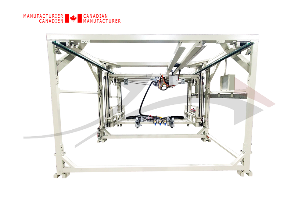 - Mouvement de positionnement 3 axes, incluant 2 lecteurs laser pour le système de ventouse permettant au système de se positionner automatiquement selon l’emplacement des embossures sur les panneaux. Ce même système gère les tolérances des panneaux pour leur positionnement mais aussi sur l’épaisseur.